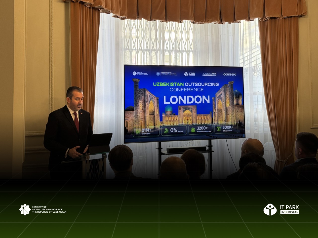 The central event of the visit was the Uzbekistan Outsourcing Conference, organized jointly with the Embassy of Uzbekistan in London. The conference brought together more than 70 guests representing over 50 companies, including Infosys, Salesforce, IBM, Deloitte, Innowise, Persistent Systems, and other major industry players.