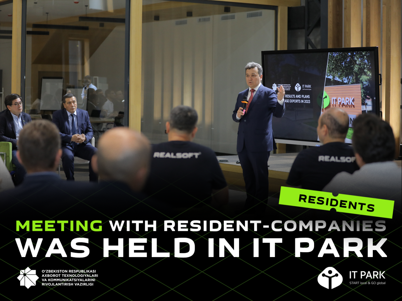 On September 23, IT Park hosted a meeting with resident exporters, which was attended by the Minister of ICT Sherzod Shermatov, Director of IT Park Farhod Ibragimov and General Director of Uzbektelecom Nazirjon Khasanov.