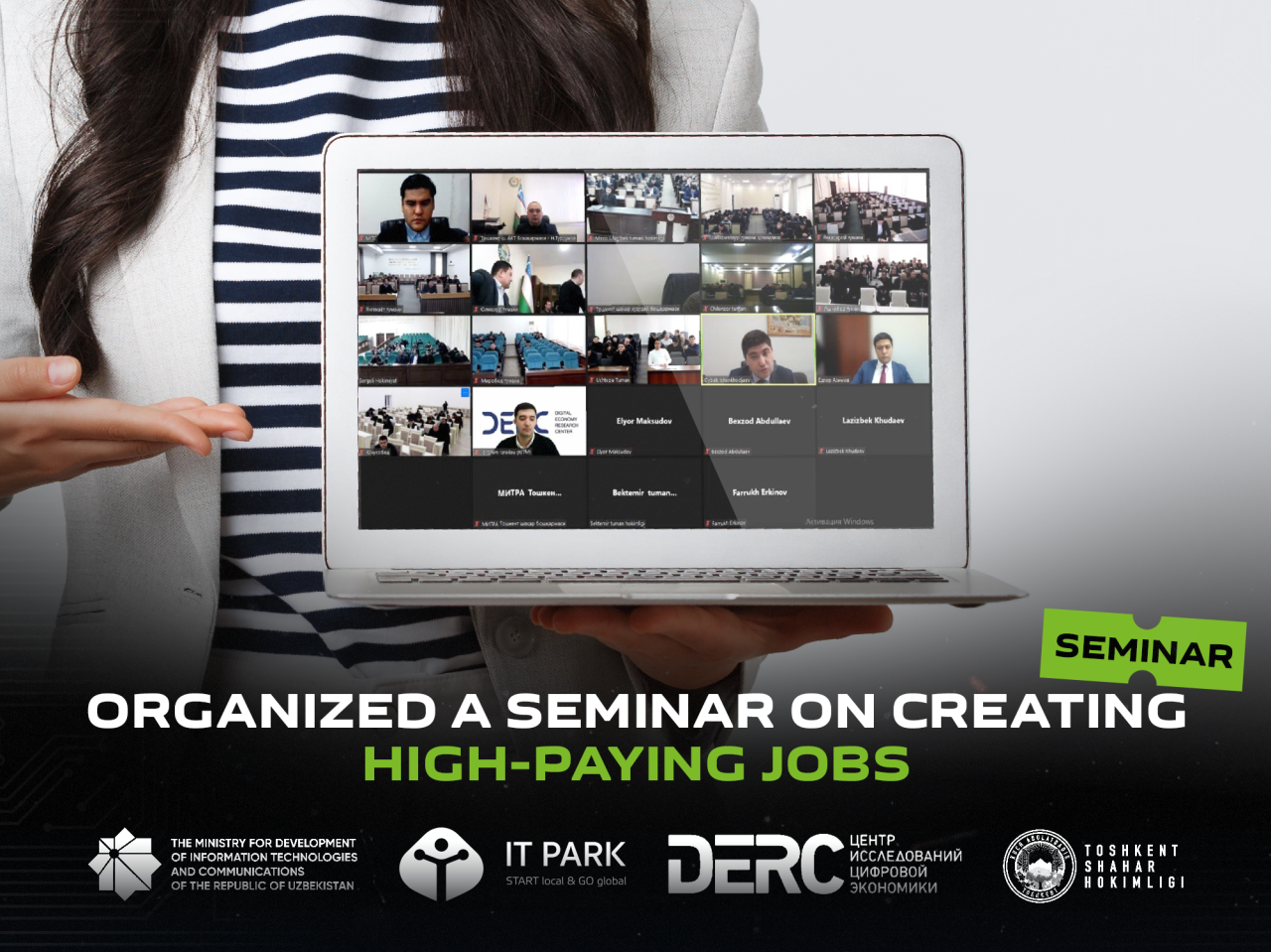 On December 23, 2022, the Ministry for Development of Information Technologies and Communications, in cooperation with IT Park, organized an online seminar on the topic “Creation of high-paying jobs through remote services (IT-outsourcing), work in IT Park and freelancing” for all assistants of district khokimyats of the city of Tashkent.