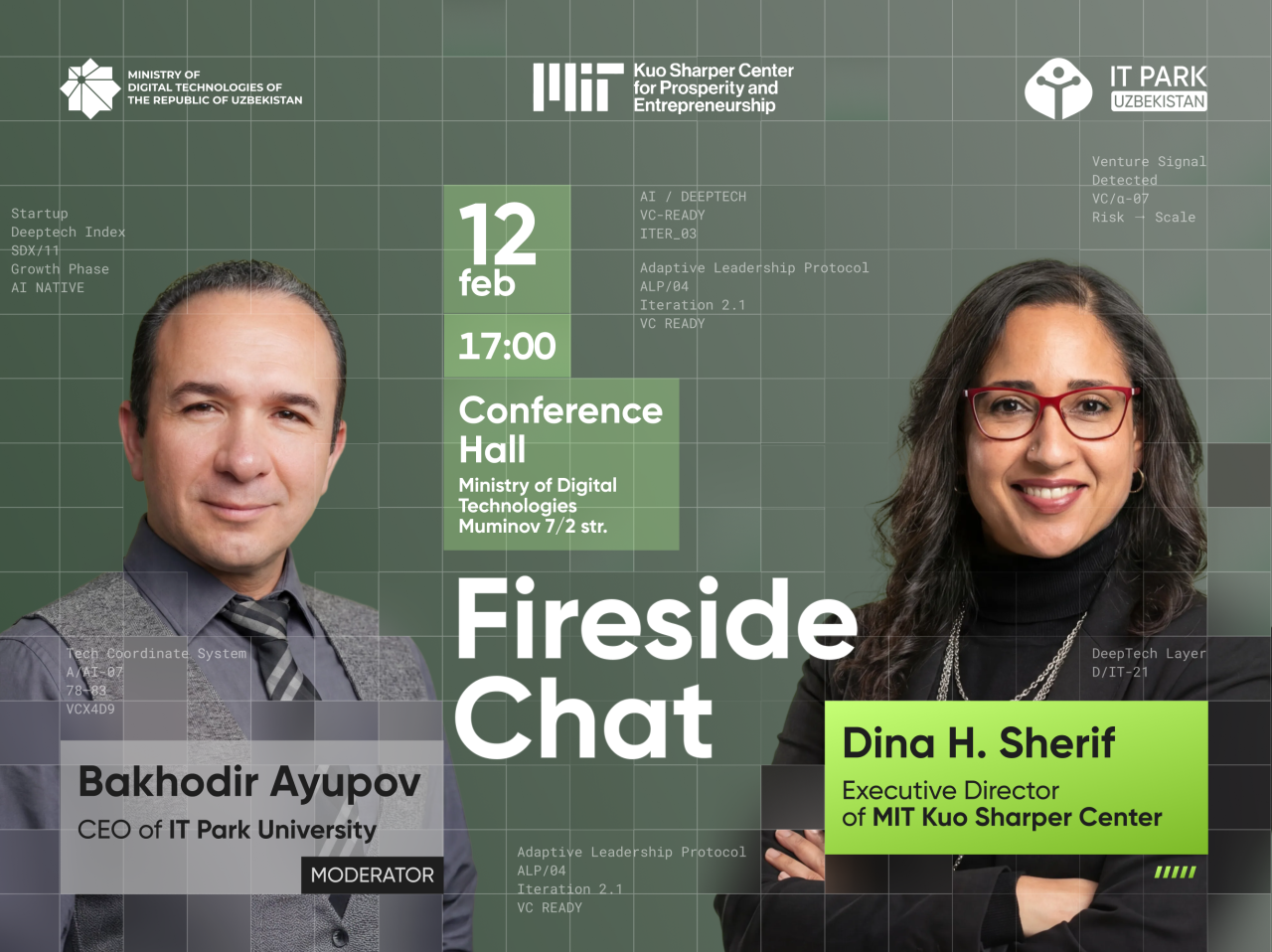 On February 12, IT Park Uzbekistan, with the support of the Ministry of Digital Technologies, invites startup founders to an exclusive Fireside Chat with Dina Sherif — one of the world’s leading experts in economic development and entrepreneurship and Executive Director of the MIT Kuo Sharper Center at MIT Sloan School of Management.