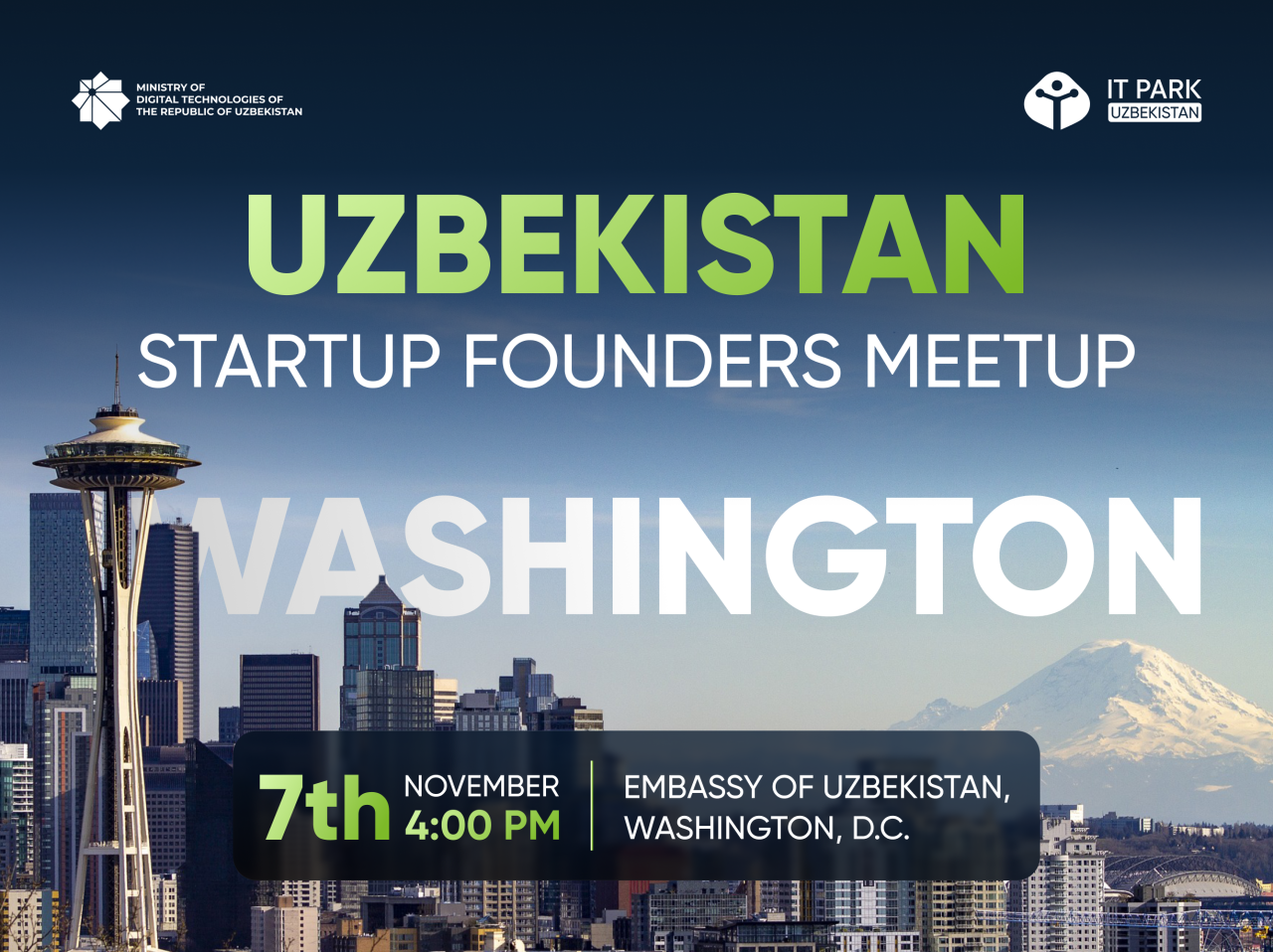 The Ministry of Digital Technologies and IT Park Uzbekistan invite members of the Uzbek diaspora in the United States — founders, innovators, and tech professionals — to join the first Uzbekistan Startup Founders Meetup in Washington, D.C.