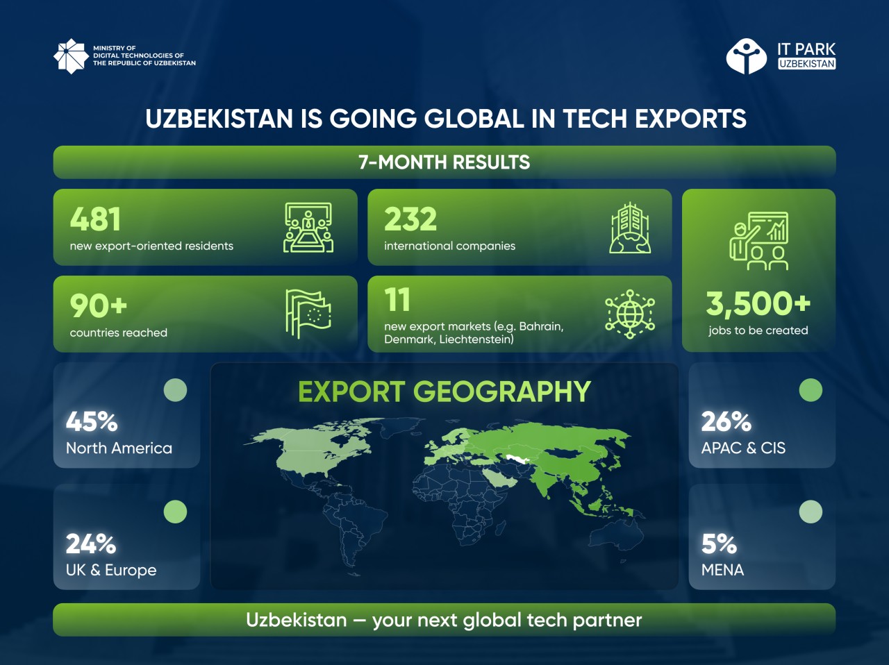 Member companies focused on international markets continue to make a significant contribution to the development of Uzbekistan’s digital economy. The 88 newly registered companies intend to provide services to foreign markets and scale their operations, leveraging the infrastructure and support offered by IT Park.