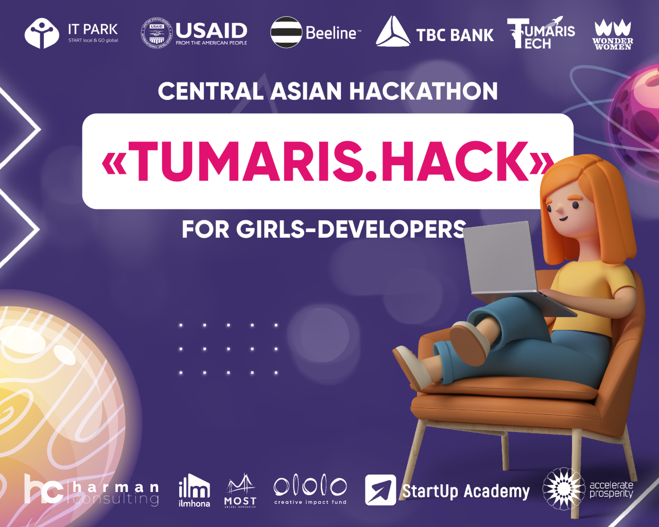 IT Park continues to support girls in IT and is in a hurry to announce great news! From April 21, the acceptance of applications for participation in the Central Asian hackathon Tumaris.Hack for female developers from Kazakhstan, Kyrgyzstan, Tajikistan, Turkmenistan and Uzbekistan starts.