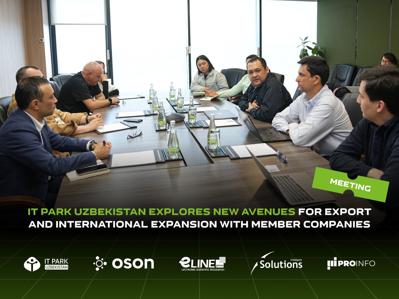 IT Park Uzbekistan hosted a meeting with its member companies, including entities with foreign capital such as BRIO GROUP (Oson), E-LINE PRESS, PROINFO, and INTELLIGENT SOLUTIONS. The discussion focused on advancing IT export development, expanding the operational scope of members, and facilitating their entry into international markets.