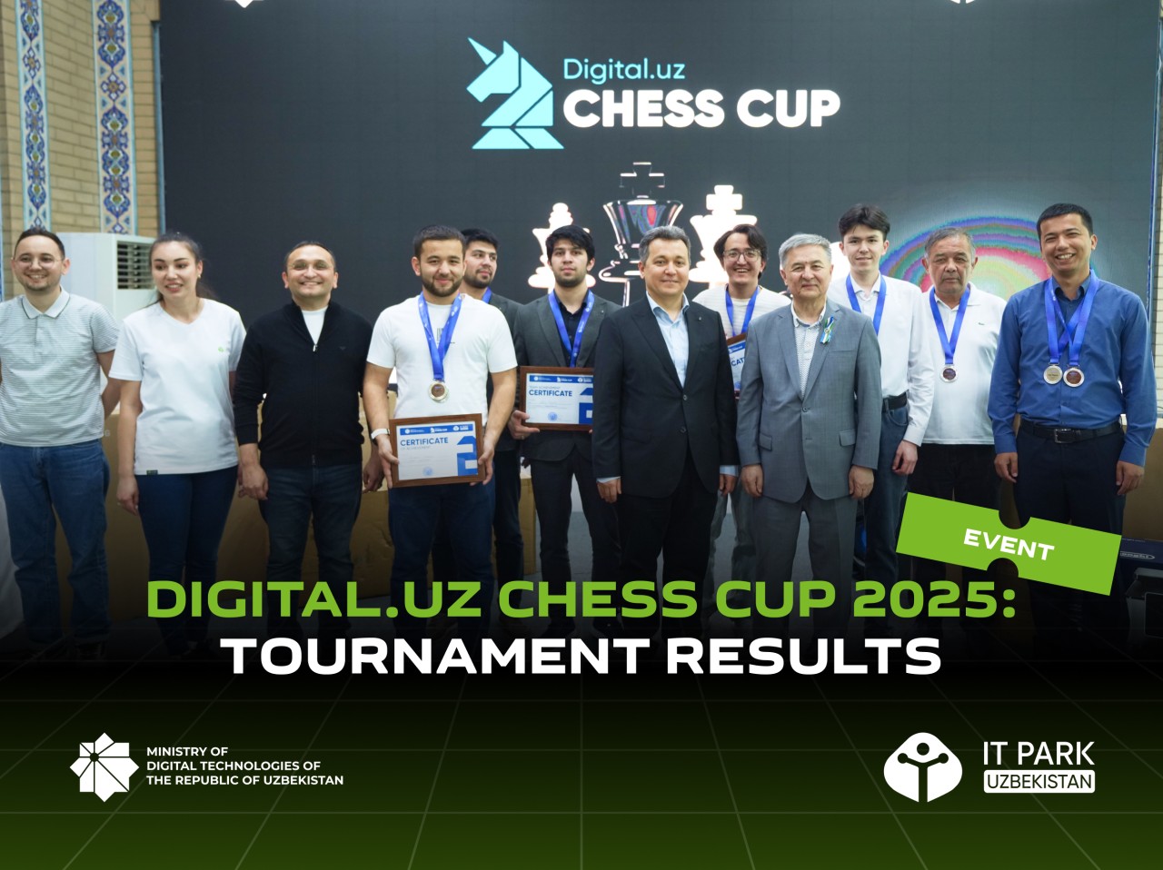 On May 3, Digital.uz Chess Cup tournament took place among employees of IT companies aimed at strengthening corporate culture, fostering strategic thinking and promoting intellectual sports. The event was organized by the Ministry of Digital Technologies of the Republic of Uzbekistan and IT Park Uzbekistan.