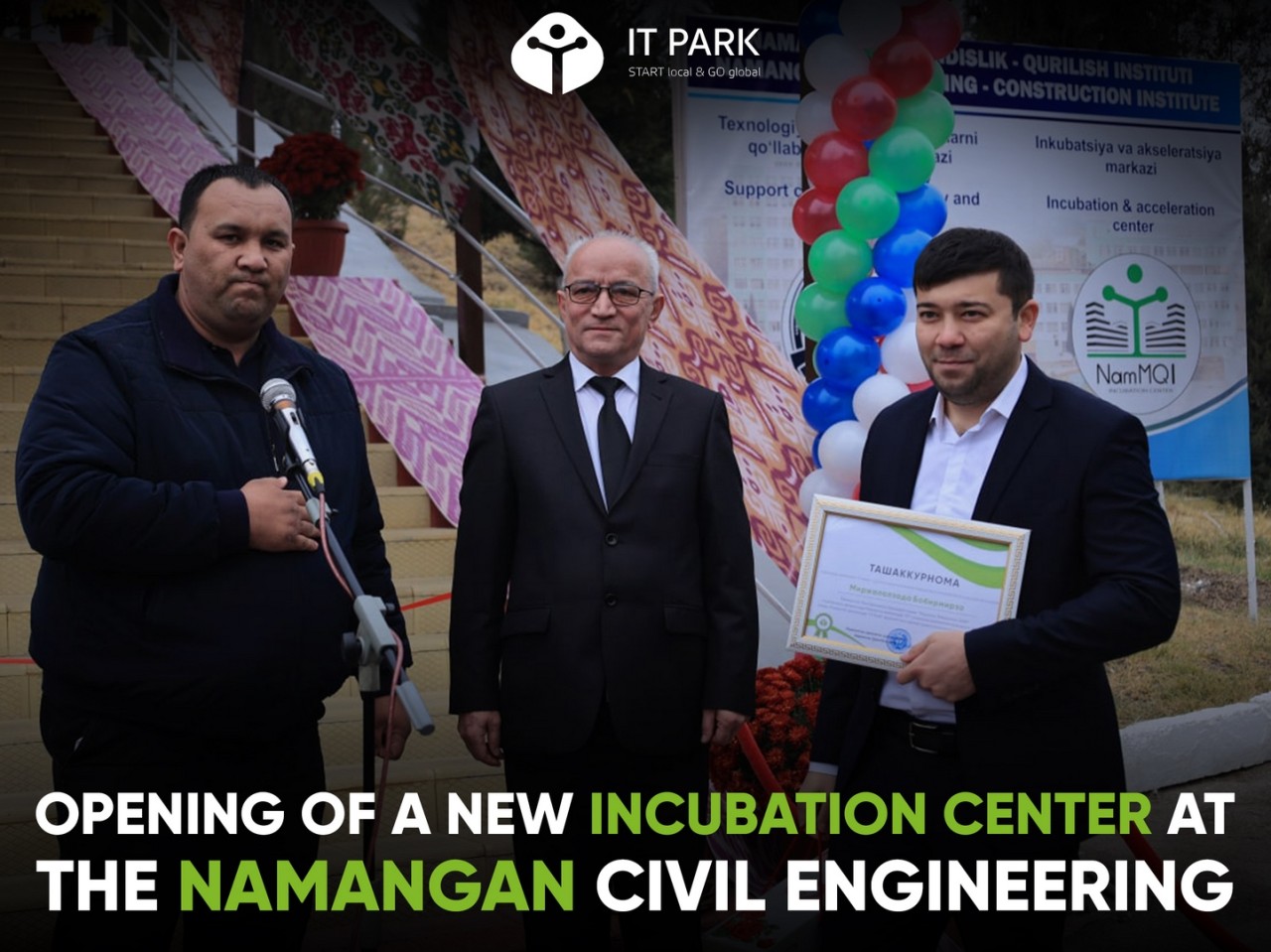 On November 27, on the initiative of IT Park, with the support of the Ministry for the Development of Information Technologies and Communications, a new incubation center was opened at the Namangan Engineering Construction Institute with the purpose of holding hackathons, ideathons, and other start-up competitions on a regular basis, as well as supporting students’ innovative projects.