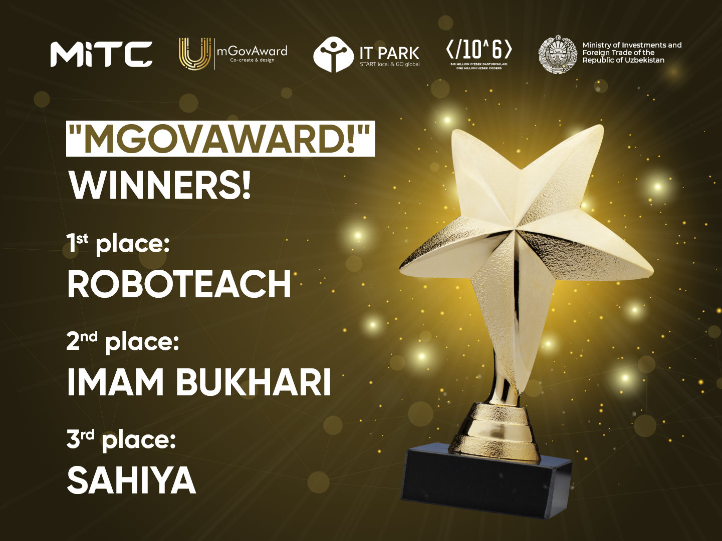 Напомним, что конкурс на разработку лучших государственных мобильных приложений «mGovAward» был организован IT Park при поддержке Министерства по развитию информационных технологий и коммуникаций Республики Узбекистан в сотрудничестве с Министерством по делам Правительства Объединенных Арабских Эмиратов при координации Министерства инвестиций и внешней торговли Республики Узбекистан.