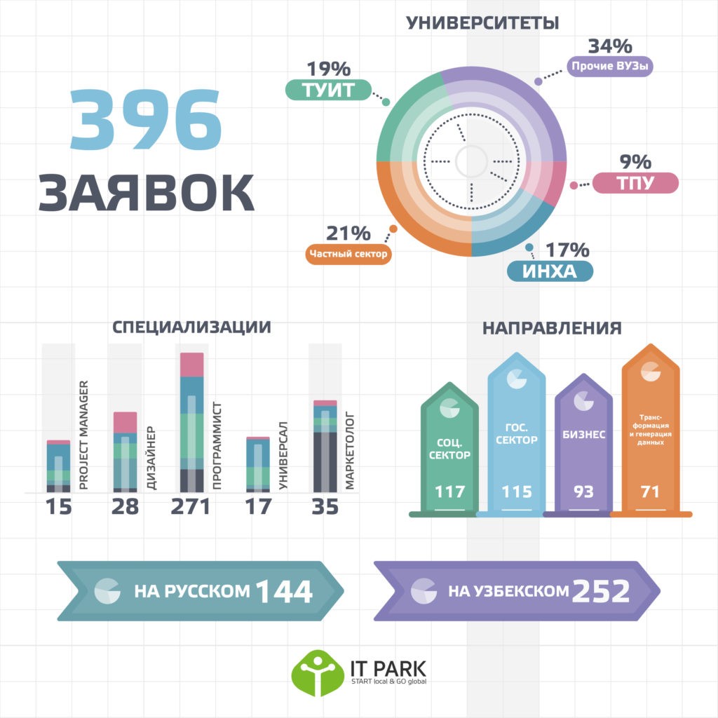 Small statistics on applications showed that most of them are freelancers and representatives of the private sector (21%), then students of the Tashkent University of Information Technology and Inha University in Tashkent (17% each), Torino Polytechnic University in Tashkent (9% ), Amity University in Tashkent (5%), International Westminster University in Tashkent (2%), academic lyceum at the International Westminster University in Tashkent, as well as other universities (24%).