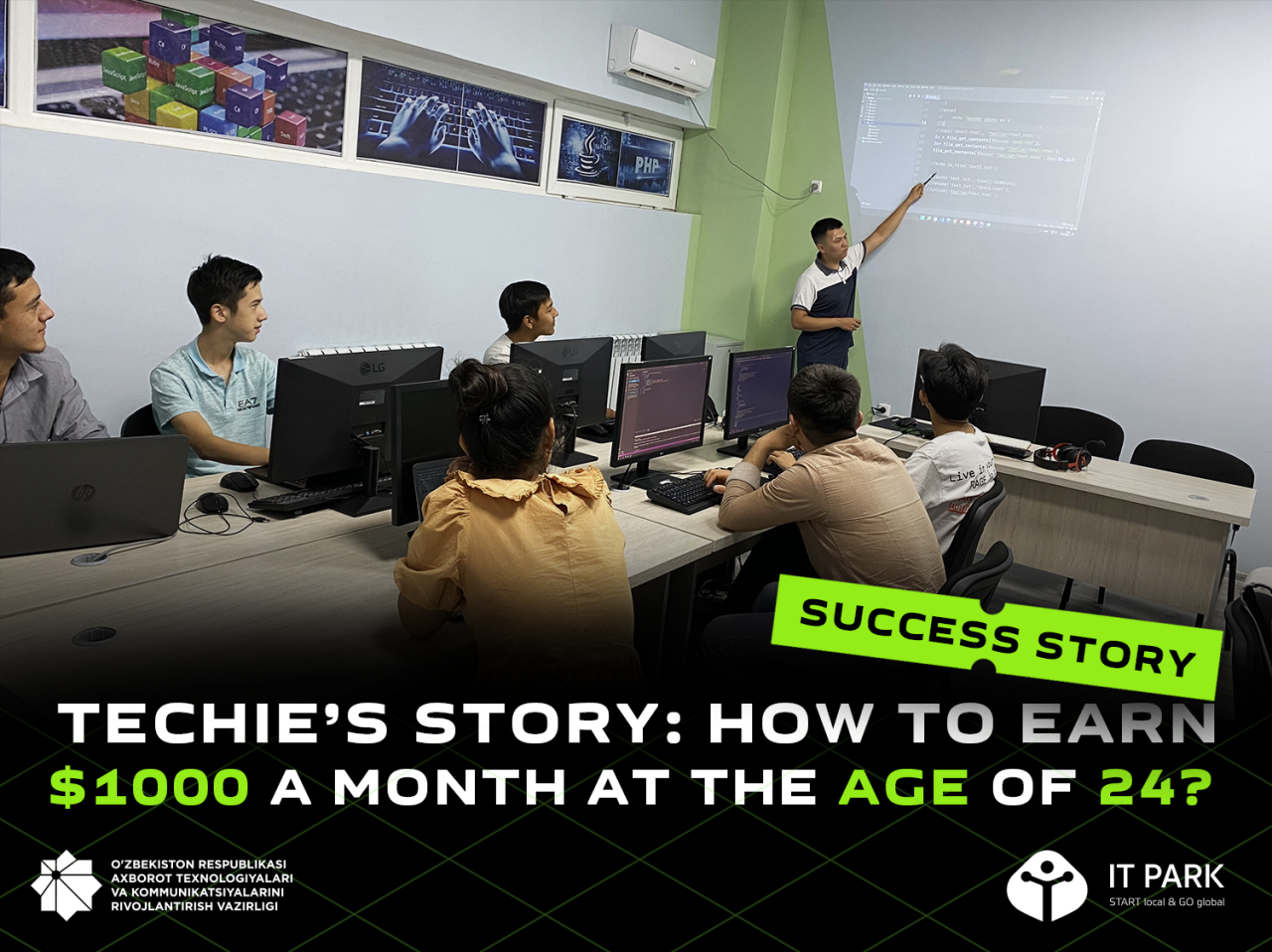 Since September 2020, Sanjarbek has been teaching frontend and backend development at the Digital Technology Center in Margilan, and since July 2021 at the IT-Center of Fergana branch of IT Park.