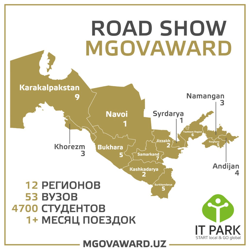 On November 11, 2019, a large-scale roadshow at higher educational institutions of Uzbekistan ended as part of the mGovAward conpetition. IT Park representatives visited 12 regions of our nation and the Republic of Karakalpakstan, traveled more than 4930 km, spoke for more than 60 hours, talked with more than 4,700 students from 53 universities and institutes!