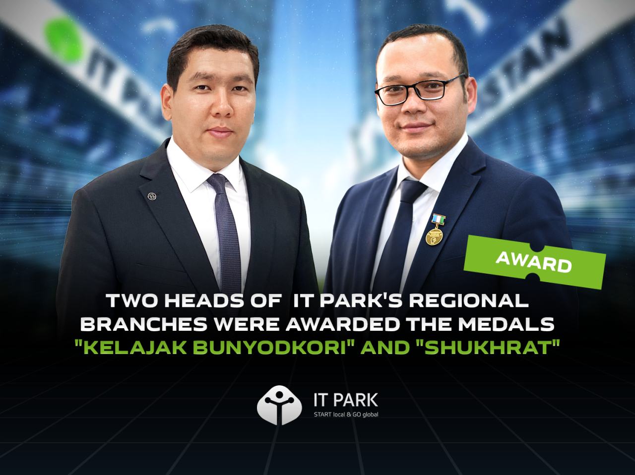 Among the awardees are the heads of the Karakalpak and Fergana branches of IT Park Madiyar Elmuratov ("Kelajak Bunyodkori" medal) and Bakhromjon Jalilov ("Shukhrat" medal).