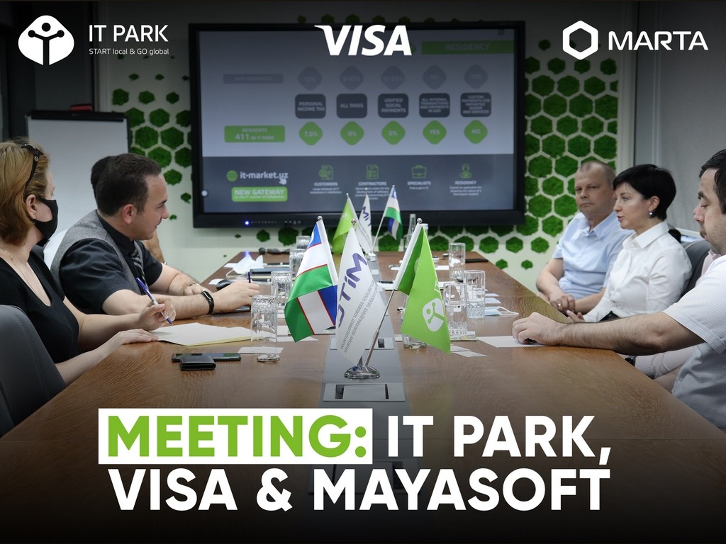 Главными участниками встречи по вопросам сотрудничества Visa с разработчиками «MARTA» MayaSoft и IT Park были заместитель директора IT Park по международной деятельности Боходир Аюпов, менеджер по международным операциям IT Park Мансур Мамаджанов, менеджер по работе с фрилансерами IT Park Нэлли Галиаскарова, а также вице-президент и региональный менеджер Visa в странах Центральной Азии и Азербайджане Кристина Дорош, старший директор и глава департамента развития бизнеса Антон Бороздин, менеджер по развитию бизнеса в Узбекистане и Туркменистане Бехзод Абдурахманов и основатель MayaSoft LLC Нодир Бадриддинов.