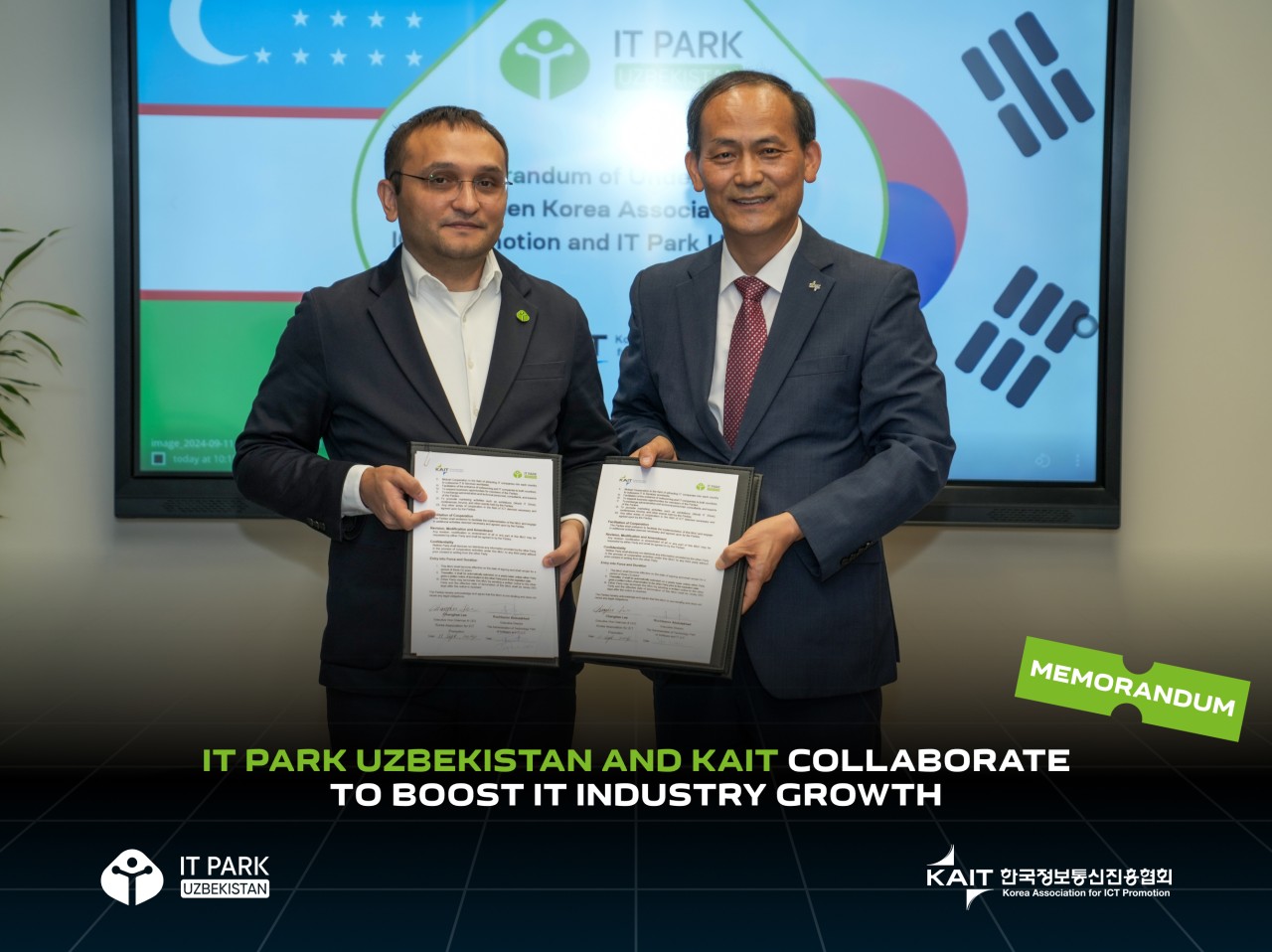 В ходе встречи был подписан Меморандум о взаимопонимании (MoU) между IT Park Uzbekistan и KAIT. Цель меморандума – углубление сотрудничества и укрепление двусторонних отношений через обмен опытом, изучение возможностей для бизнеса и продвижение деятельности в сфере ИКТ как на корейском, так и на узбекском рынках.