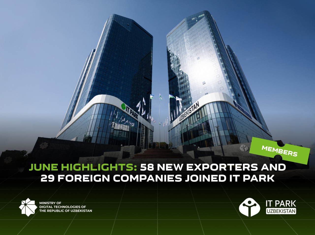 IT Park yangi rezidentlarni qabul qilish va mamlakatning eksport salohiyatini rivojlantirish uchun sharoit yaratishni davom ettirmoqda. 2025-yil iyun oyida ekotizimga xorijiy bozorlar va xalqaro hamkorlikka yo‘naltirilgan o‘nlab yangi kompaniyalar qo‘shildi.