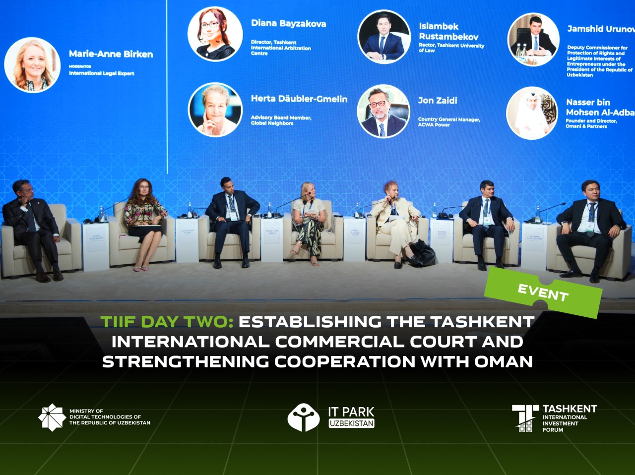 IV Toshkent xalqaro investitsiya forumining ikkinchi kunida “O‘zbekistonda xalqaro nizolarni hal etish: Toshkent xalqaro tijorat sudi” mavzusida panel sessiyasi o‘tkazildi. Muhokamaning maqsadi xalqaro tijorat nizolarini hal qilish uchun yangi mustaqil institut konsepsiyasini taqdim etish va uning mamlakat investitsiya muhitini yaxshilashdagi potensial rolini ko‘rsatishdan iborat bo‘ldi. Forum doirasida IT Park vakillari Ummon kompaniyalari bilan ham uchrashuvlar o‘tkazdi.