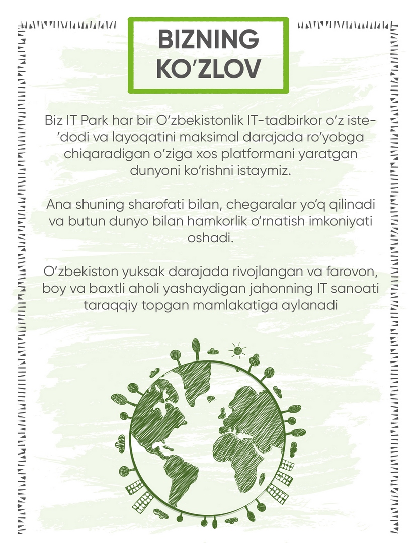 IT Park – bu IT-kompaniyalar uchun istiqbolli boshlangʻich loyihalarni, tashqi iqtisodiy zonani, shu jumladan ilmiy va taʼlim tashkilotlari bilan integratsiyalashgan holda ishga tushirish va bozorga chiqarishni taʼminlash uchun moʻljallangan obyektlar, bino va inshootlar majmuasi. IT sohasida faol va iqtidorli insonlar buxgalteriya hisobi, yuridik, marketing va taʼlim orqali oʻz gʻoyalarini haqiqiy biznes loyihalariga aylantirish uchun haqiqiy imkoniyatga ega boʻladigan joy.