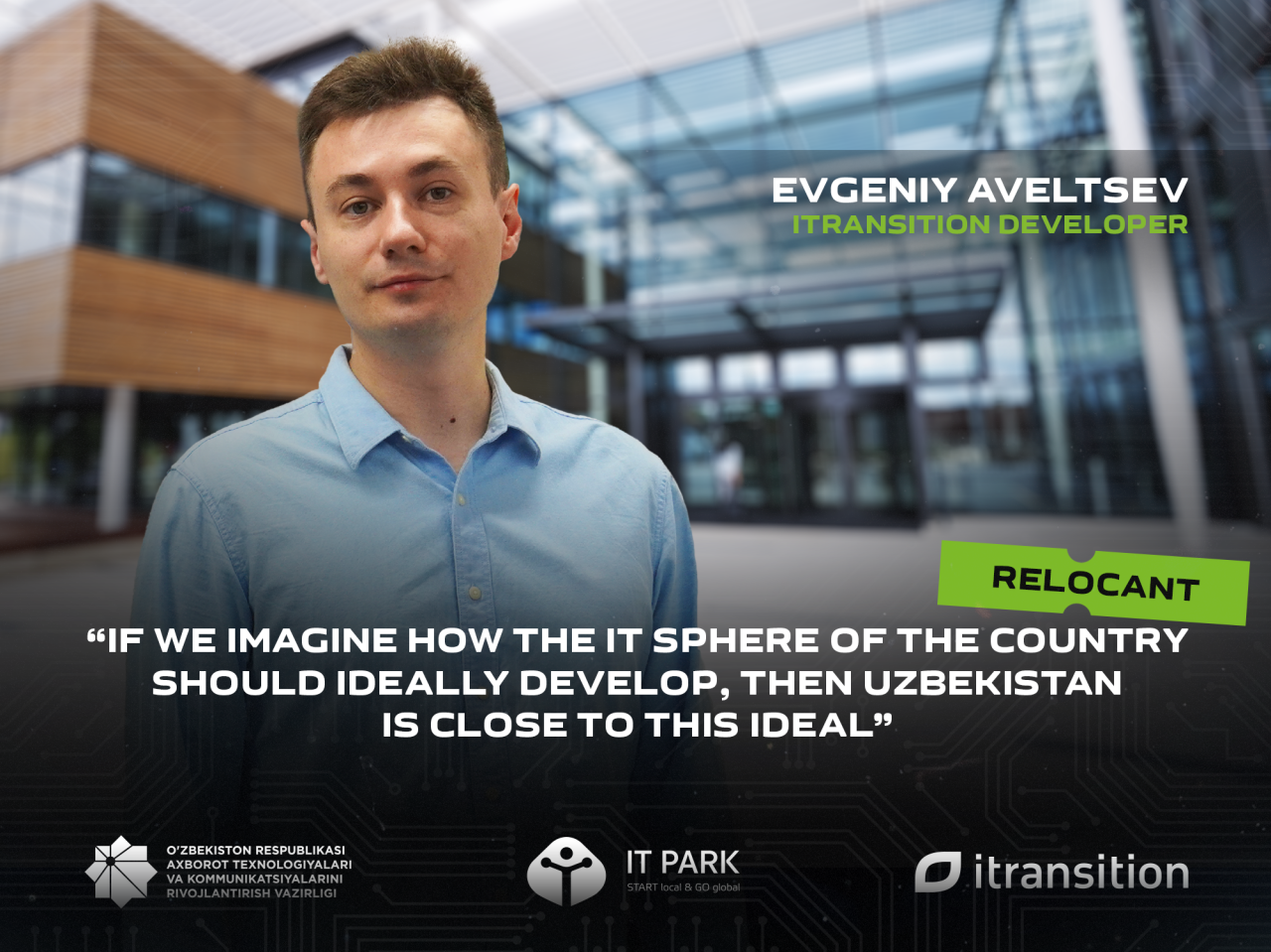 “Men begona mamlakatga keldim va shaharda moʻljal ololmadim. Boshida kimningdir yordamisiz juda qiyin – hech boʻlmaganda aeroportda kutib olish va mehmonxonagacha yetib olish uchun koʻmak kerak. Bu juda quvonarli boʻldi. IT Park menga uy topishda ham yordam berdi va bir necha kun ichida biz hamma narsani rasmiylashtirdik va joylashib oldik. Biroq eng muhim yordam shundaki, IT Park hatto mavjudligi. Demak, davlat IT yoʻnalishidan manfaatdor ekanligini anglatadi”.